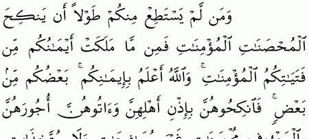 و م ن ل م ي س ت ط ع م ن ك م ط و ل ا أ ن ي ن ك ح ال م ح ص ن ات ال م ؤ م ن ات ف م ن م ا م ل ك ت أ ي م ان ك م م ن ف ت ي ات ك م ال م ؤ م ن ات و الل ه أ ع ل م ب إ يم ان ك م ب ع ض ك م م ن ب ع ض ف ان ك ح وه ن ب إ ذ ن أ ه ل ه ن