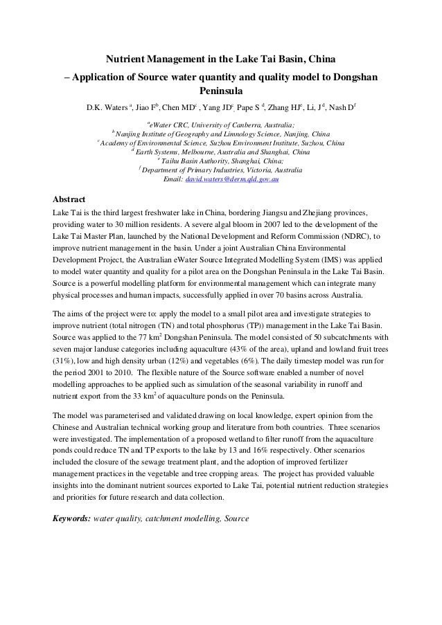 Application Of Source Water Quantity And Quality Model To Dongshan Pe